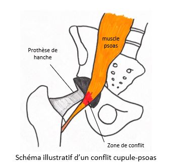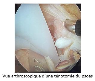 - Tendinopathies ou bursites péritrochantériennes. Il s’agit d’une inflammation des parties molles, habituellement traitées par un traitement médical, mais certaines formes résistantes peuvent relever d’une indication chirurgicale. Par exemple, après prothèse totale de hanche, il peut arriver qu’il y ait un contact entre le tendon du muscle psoas et la cupule acétabulaire. Ce conflit peut occasionner une tendinite, souvent améliorée par la rééducation et les infiltrations, mais certaines formes peuvent être résistantes et nécessitent une section chirurgicale du tendon (=ténotomie).